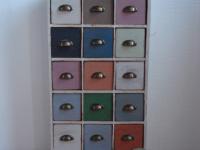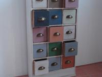 Cassettiera bianca / avorio invecchiata con 15 cassetti di diversi colori