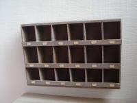 Wooden shelves painted ivory, white or grey with labels