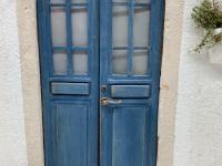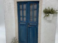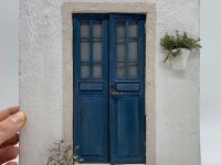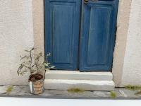 Riproduzione di una porta greca con vaso appeso e pianta di ulivo
