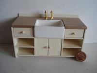 Mobile da cucina con lavello in legno dipinto color avorio, invecchiato, con ante e cassetti.