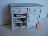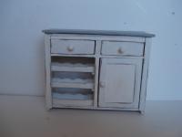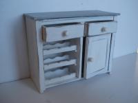 Mobile con anta, cassetti e portabottiglie in legno bianco decorato in stile shabby.